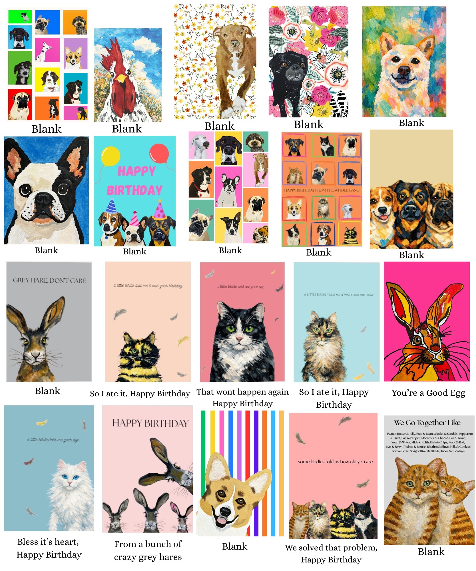 Yes, I paint dogs and cats, and recently hares, I even painted a horse once, it didn’t go well, so no horses. Before I ever painted a rockstar, I painted our four legged friends. If you are interested in one of these paintings I will explain a little bit about the process. I am also have come out with a line of fun, sometimes snarky animal greeting cards. Please feel free to reach out on my contact page about the cards. Follow me on IG @petportraitsbytonya to see all new designs